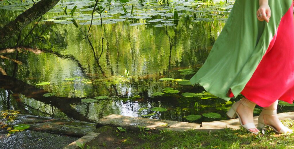 Robe de soirée sur-mesure éco-responsable à manche papillons et jupe qui tourne colorblock créée par Coralie Borowski en Seine-maritime