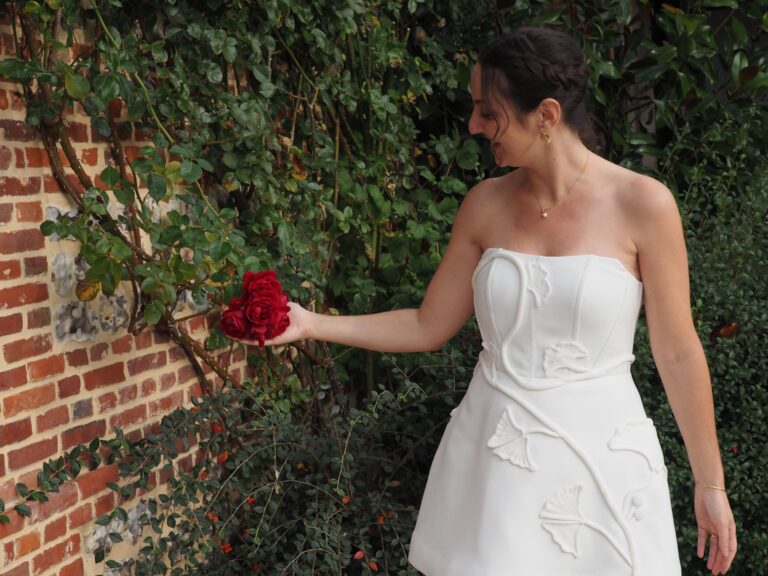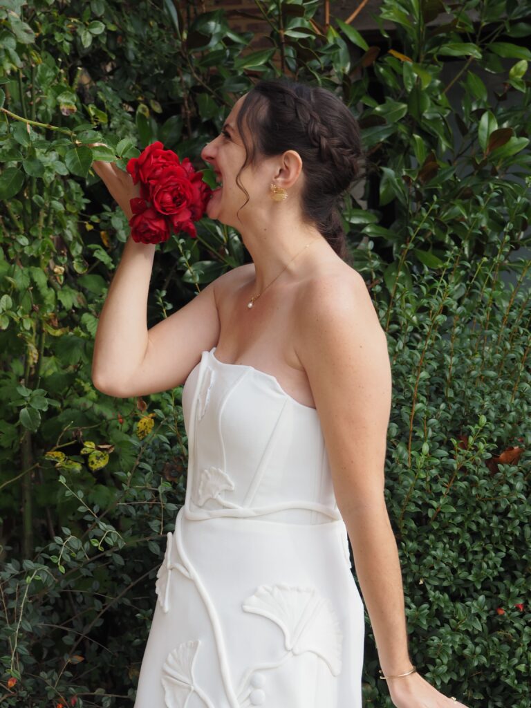 Robe de mariée sur-mesure courte bustier avec motifs de gingko biloba, création de Coralie Borowski au Havre
