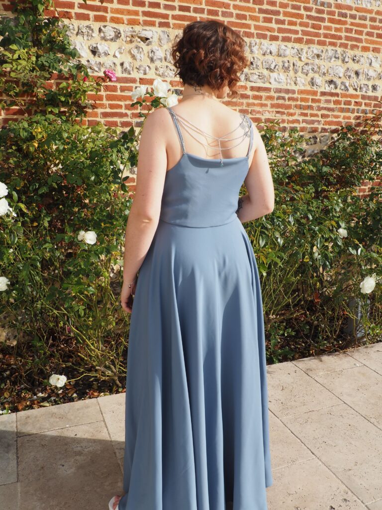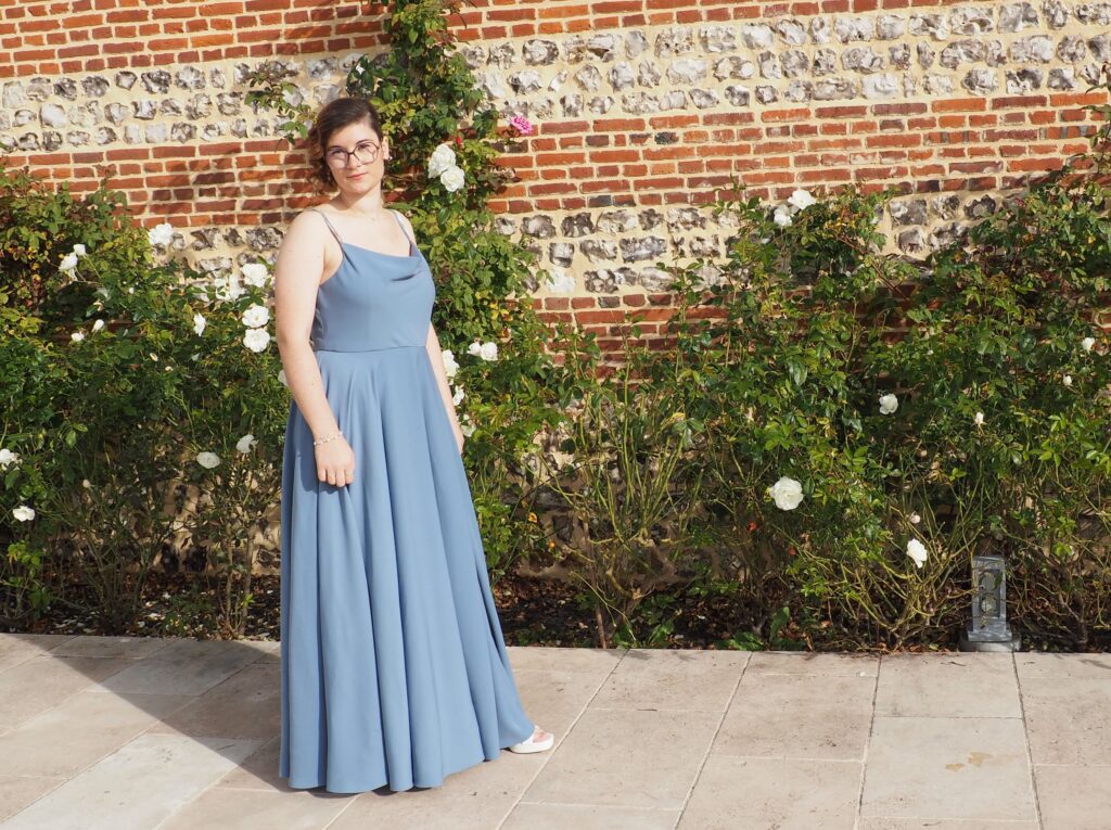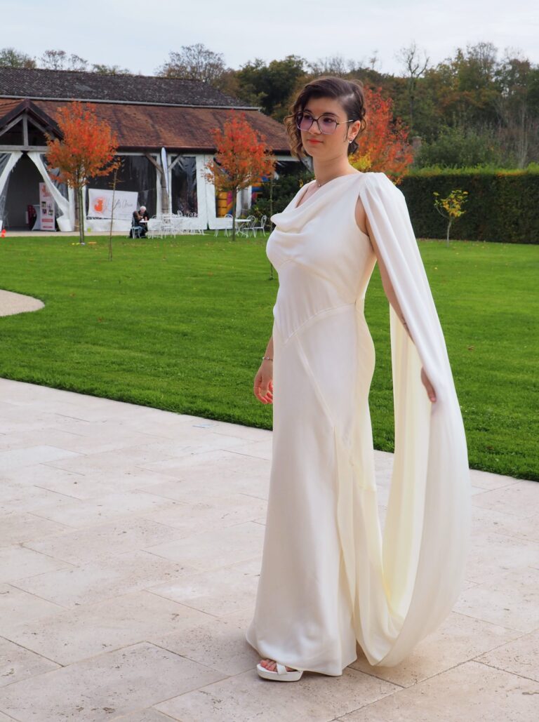 Robe de soirée sur-mesure éco-responsable à manche papillons et jupe qui tourne colorblock créée par Coralie Borowski au Havre